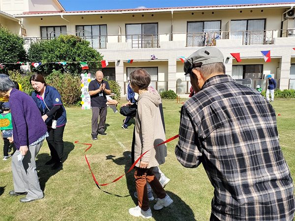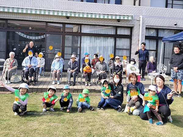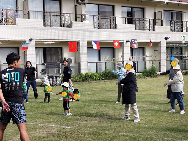 去る10月24日、秋晴れの中、ロイヤルハウス石岡新館中庭に於いて、かがやき保育園・新館ご入居者合同での「秋の運動会」が開催されました。