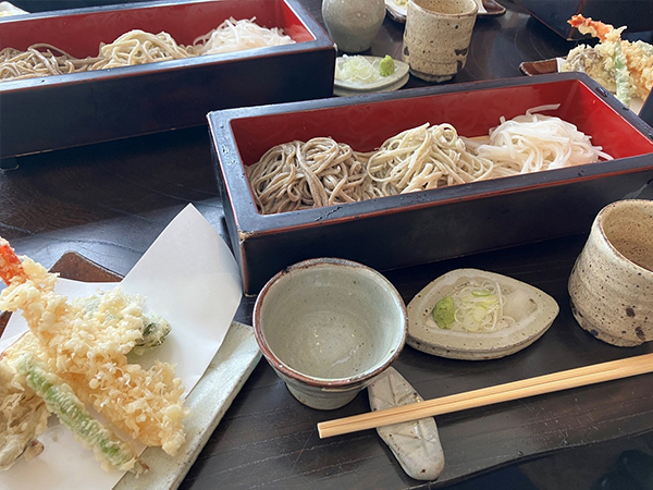 手前右から更科そば、発芽そば、十割そば🎵そして揚げたて天ぷら 🦐