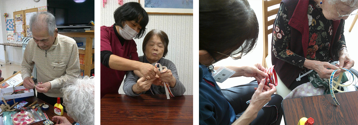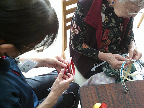 今回は、クラフトバンドを趣味にされている入居者の方に教えていただきながら、みんなで作品づくりに挑戦しました!