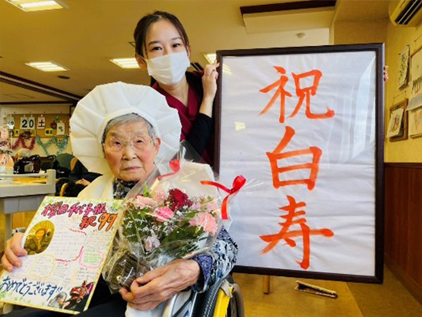 ご入居者様の「白寿」のお祝いをさせていただきました。お花とメッセージを書いた色紙を差し上げました。他の皆さん方からも「おめでとう!!!」の声が上がりとても温かい雰囲気に「長生きして良かったぁ」とおっしゃっていました。これから元気でお過ごしください。