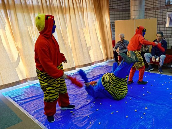 入居者様1人1人に豆を配り鬼に向かって元気よく